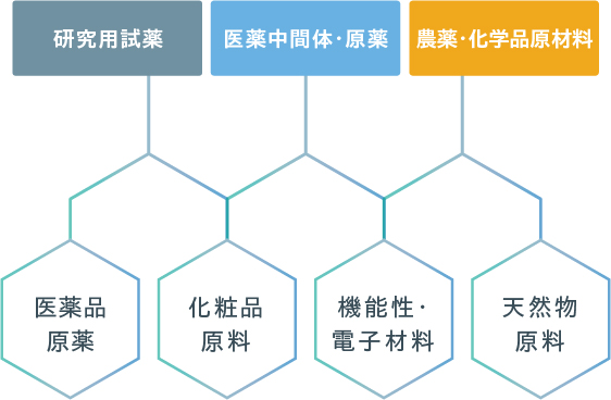 医薬中間体、医薬品原薬、合成用試薬、農薬・化学品原材料、化学工業製品、電子材料、天然物抽出物のエキス・パウダー等の輸入販売